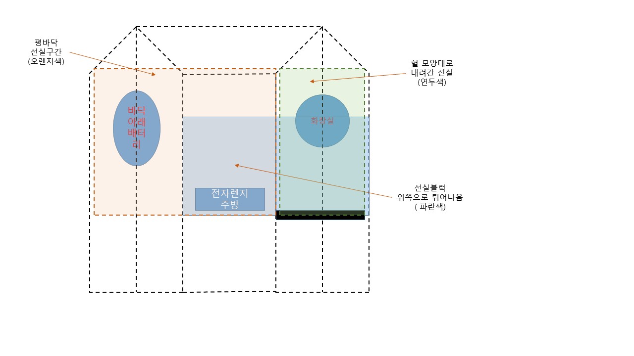 앞쪽으로는 화장실을 배치합니다.. 위 사진중 파란색 블럭구간은 캐스팅 데크 위쪽으로 올라갈 것이므로