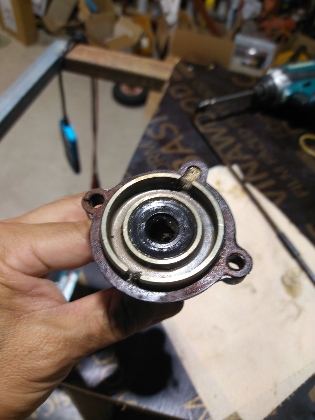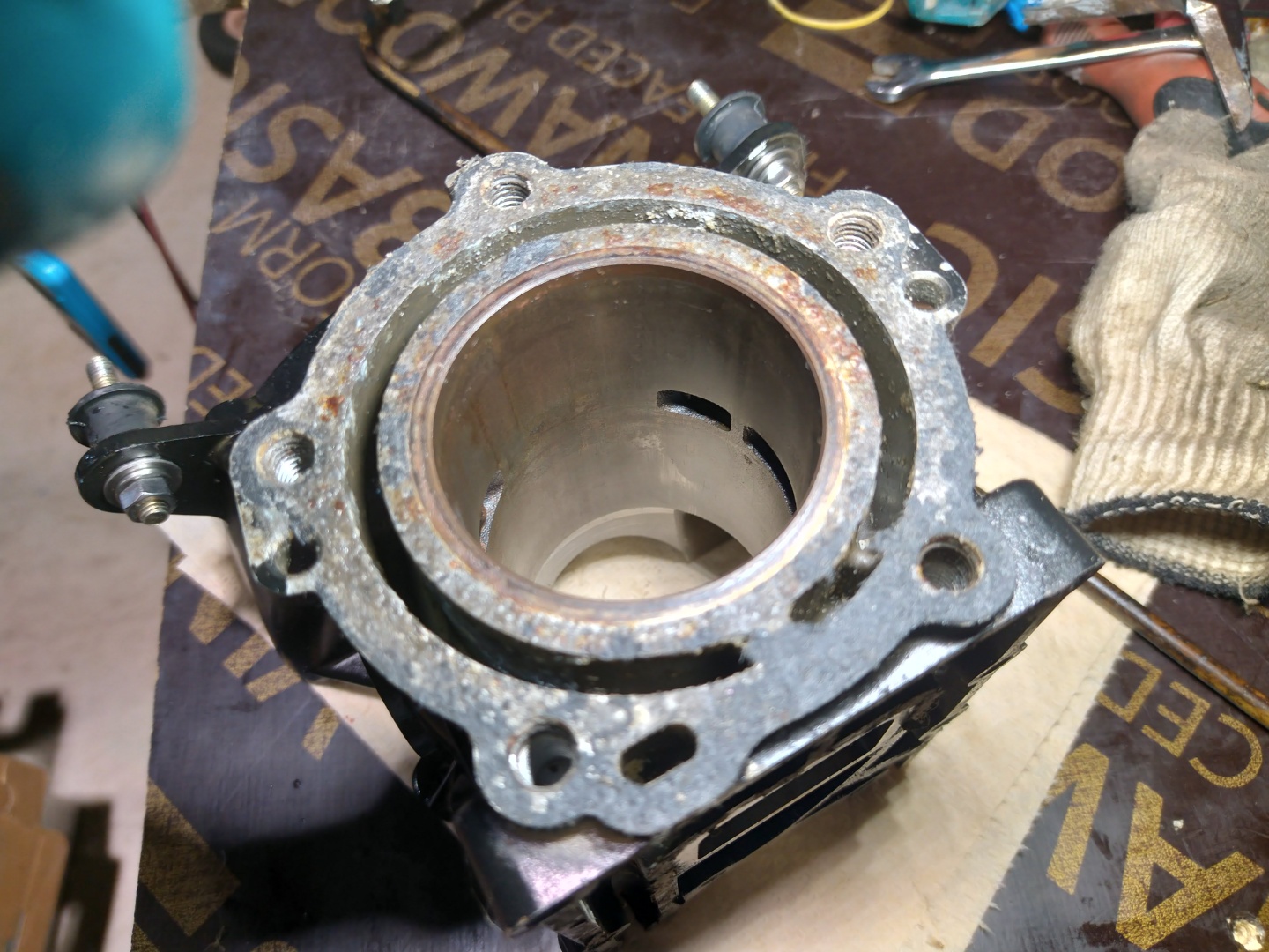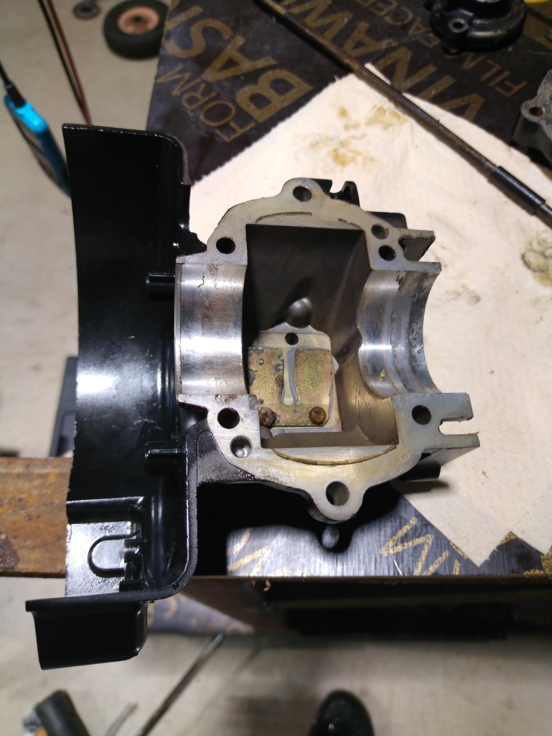 연료에 수분이 섞여들어간 채로 방치되어 크랭크 부식으로 못쓰게 된 것으로 실린더 안쪽에 약간의 녹얼룩이 비치지만