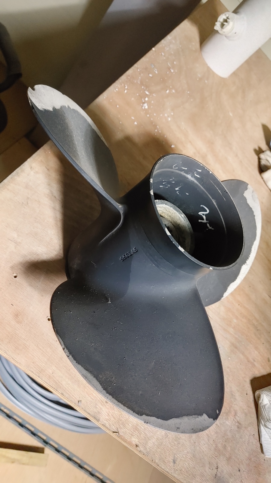 야마하 150마력 이상 19피치 스텐플롭입니다. 사진과 같이 수리이력 있습니다.