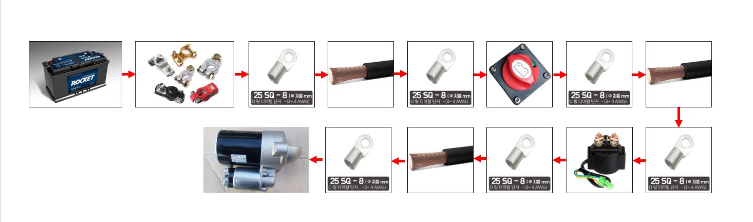 보통 요즘 일반적인 배선하는 걸 볼때 배터리에서 스타트모터 까지 가는 과정을 살펴보면 아래와 같습니다.